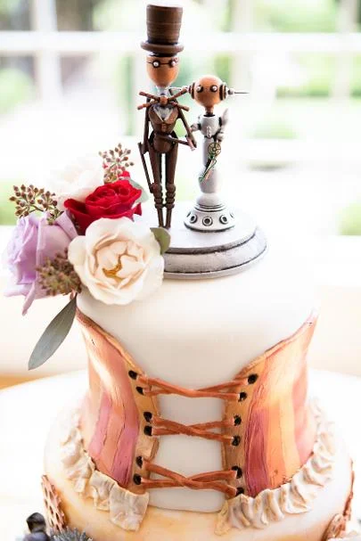 The cake took a lot of turns... at first, Lauren wanted a traditional wedding cake with flowers to match the rest of the flowers in the room. We could tell she wanted it to have a steampunk look, but was afraid it would be too much. She finally gave us the go ahead to design it the way we wanted to and knew she would love. We designed her cake to be beautiful and also reflect the rest of the wedding. Most of the elements on the cake were hand cut and made by us. There were no steampunk molds back then. We just kinda designed it as we went. She never saw the final design until the day of the wedding. Sure enough, both she and Danny loved the cake.